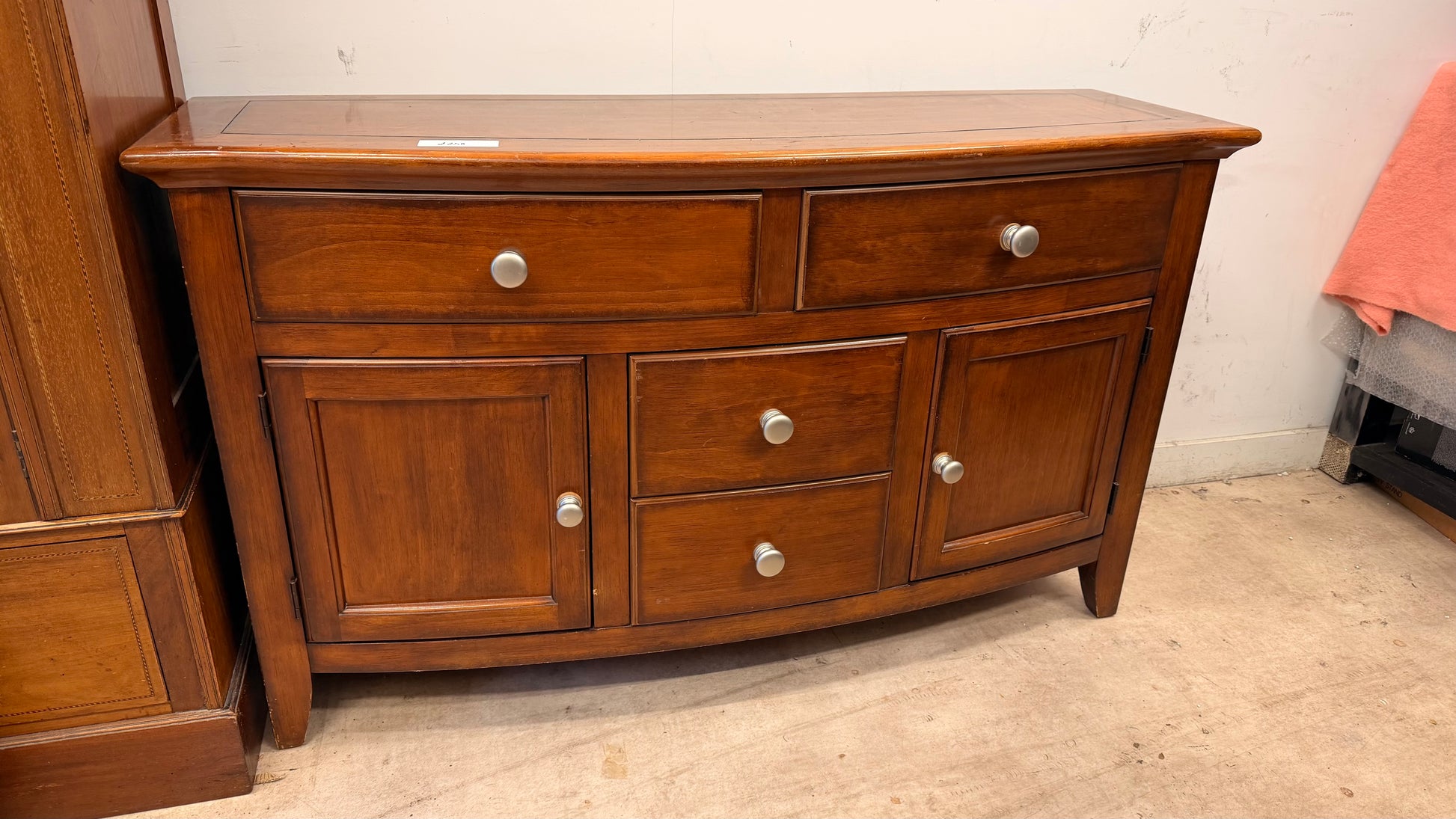 The versatile storage configuration includes four spacious drawers and two cupboards with internal shelving, providing plenty of room for dining essentials, linens, or display items. Brushed nickel round knobs complement the traditional design while keeping the look refined and understated.