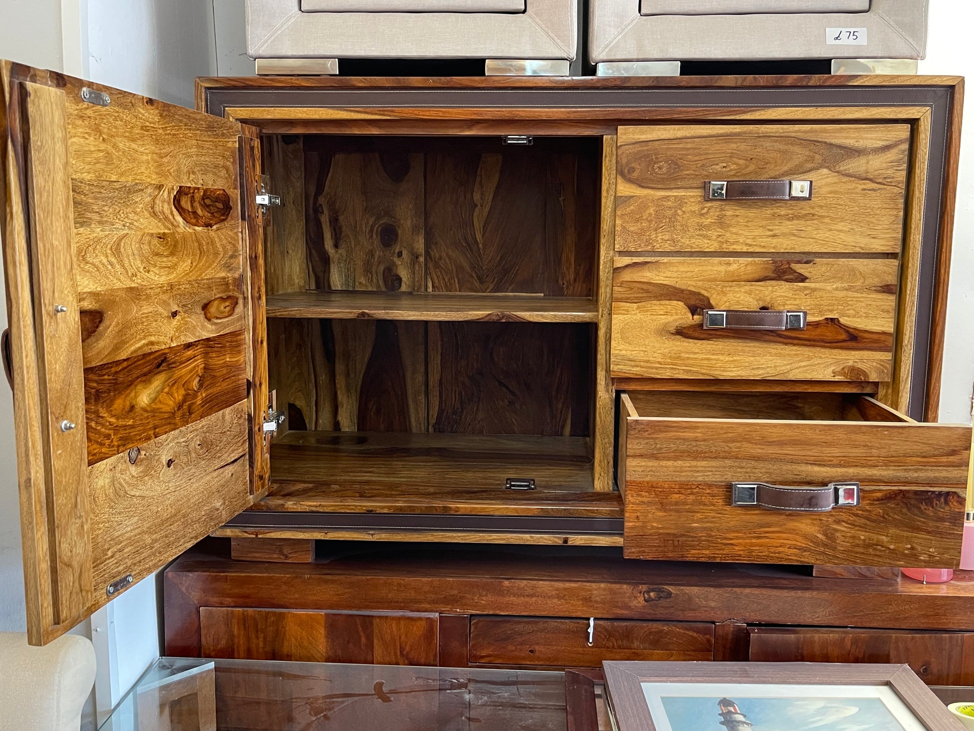 Solid Sheesham Wood Sideboard - Leather Trim & Handles