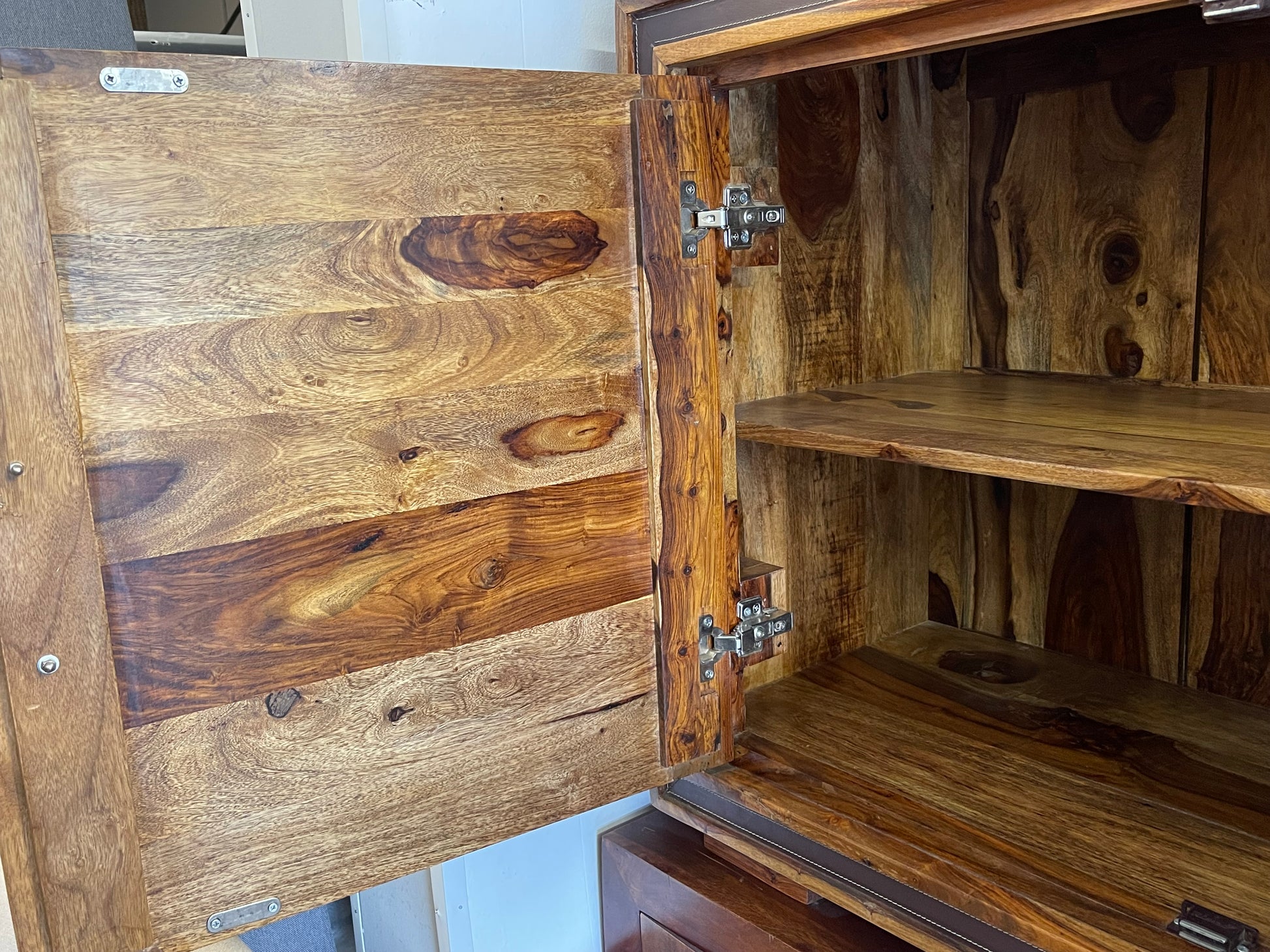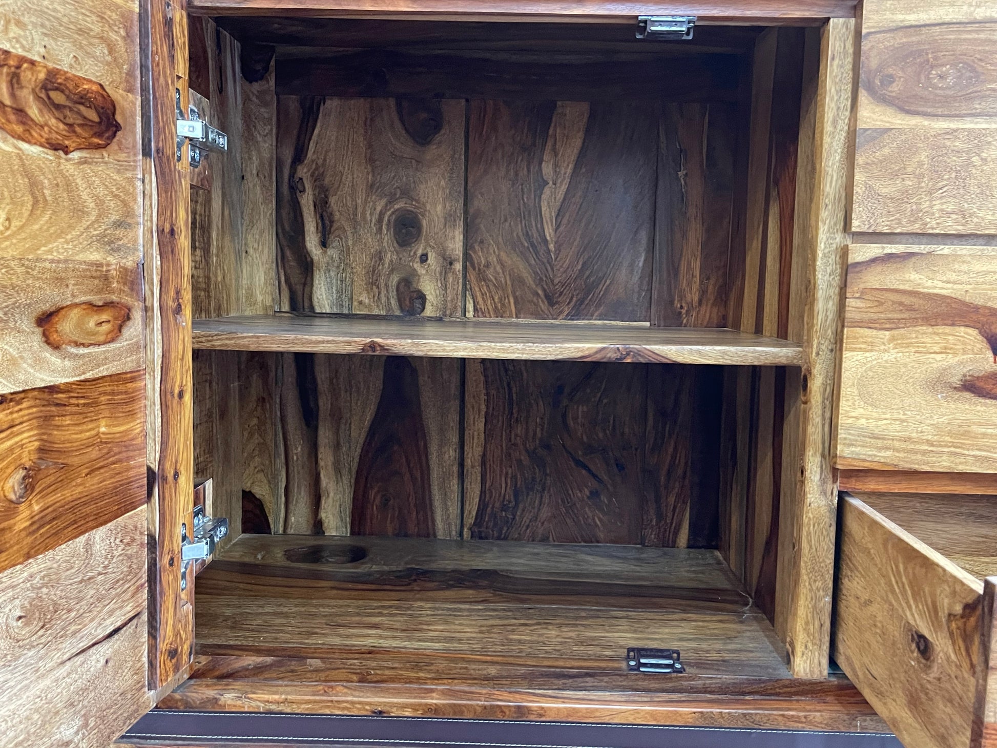 This exquisite sideboard is crafted from solid Indian Sheesham wood (also known as Indian Rosewood), showcasing the distinctive rich golden and dark brown grain patterns that make each piece unique. The wood’s natural variations, knots, and figuring create a truly one-of-a-kind aesthetic.